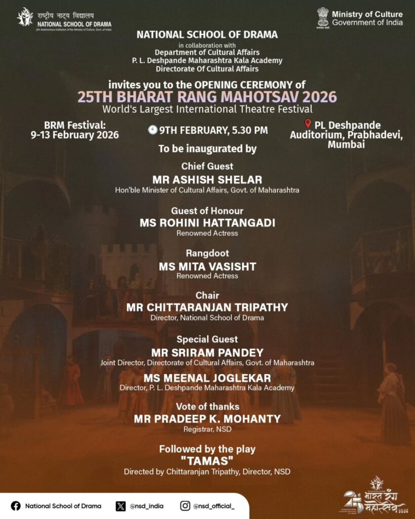 As part of Bharat Rang Mahotsav 2026, the Opening Ceremony of the 25th edition of Bharat Rang Mahotssav, the world’s largest International theatre festival, will be held at P.L.Deshpande Auditorium,Prabhadevi, Mumbai, marking the formal inauguration of the festival’s Mumbai chapter.